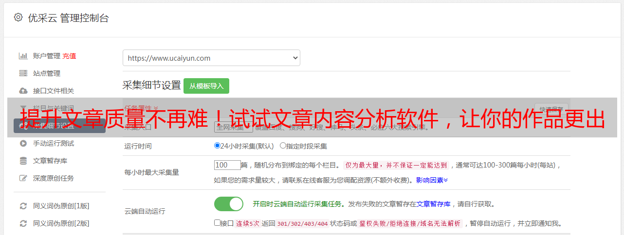 总之,在自媒体领域中想要取得成功并不容易,需要不断学习与尝试。而使用一款强大的工具——文章内容分析软件,则能够大幅提高自己写作水平与效率,并让自己在市场中更精准定位与脱颖而出。如果你有需要,请尝试使用我们公司提供的优采云(www.ucaiyun.com),为你节省时间与精力,并让你更加专注于创作与沉淀!