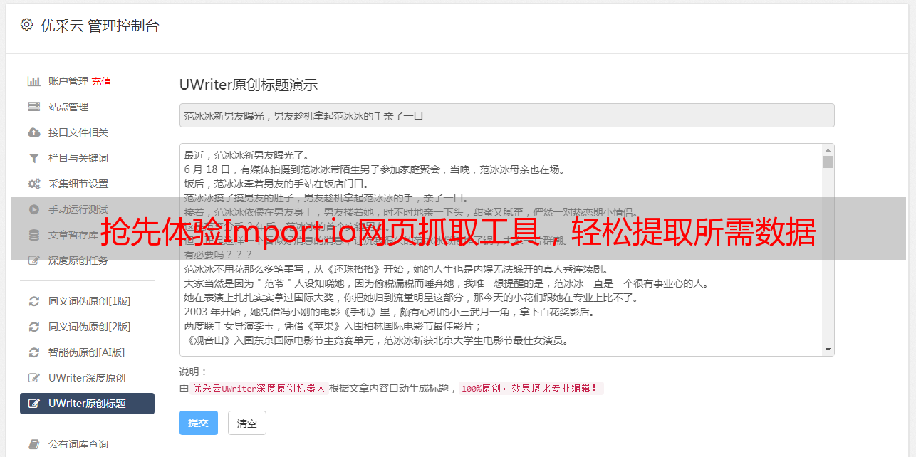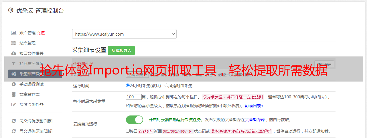 优采云 发布时间: 2023-03-13 11:21在当今数字化时代,信息的获取和分析变得越来越重要。无论是企业需要分析市场趋势,还是个人需要收集相关数据,网页抓取工具都成为了必不可少的工具之一。而Import.io作为一款领先的网页抓取工具,受到了越来越多用户的青睐。