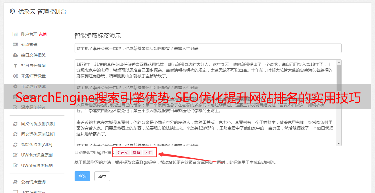 优采云 发布时间: 2023-03-13 13:13在现代社会,搜索引擎已经成为人们获取信息的主要途径,而其中最为著名的就是谷歌。但是,作为一个自媒体人,除了使用搜索引擎来获取信息外,我们还需要了解搜索引擎的优势以及如何利用SEO优化来提高自己的网站排名。本文将从以下10个方面进行逐步分析讨论。