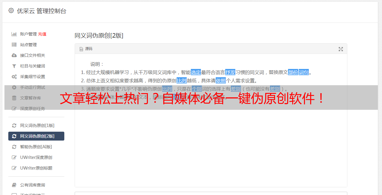 优采云 发布时间: 2023-03-13 17:16自媒体这个行业越来越火爆了,但是每天发布的文章数量也越来越多,如何让自己的文章脱颖而出,成为热门文章,已经成为每个自媒体人必须要解决的问题。而最近出现的一款自媒体一键伪原创软件,能够解决这个问题,让你的文章轻松上热门!下面我们就来详细了解一下这款软件。