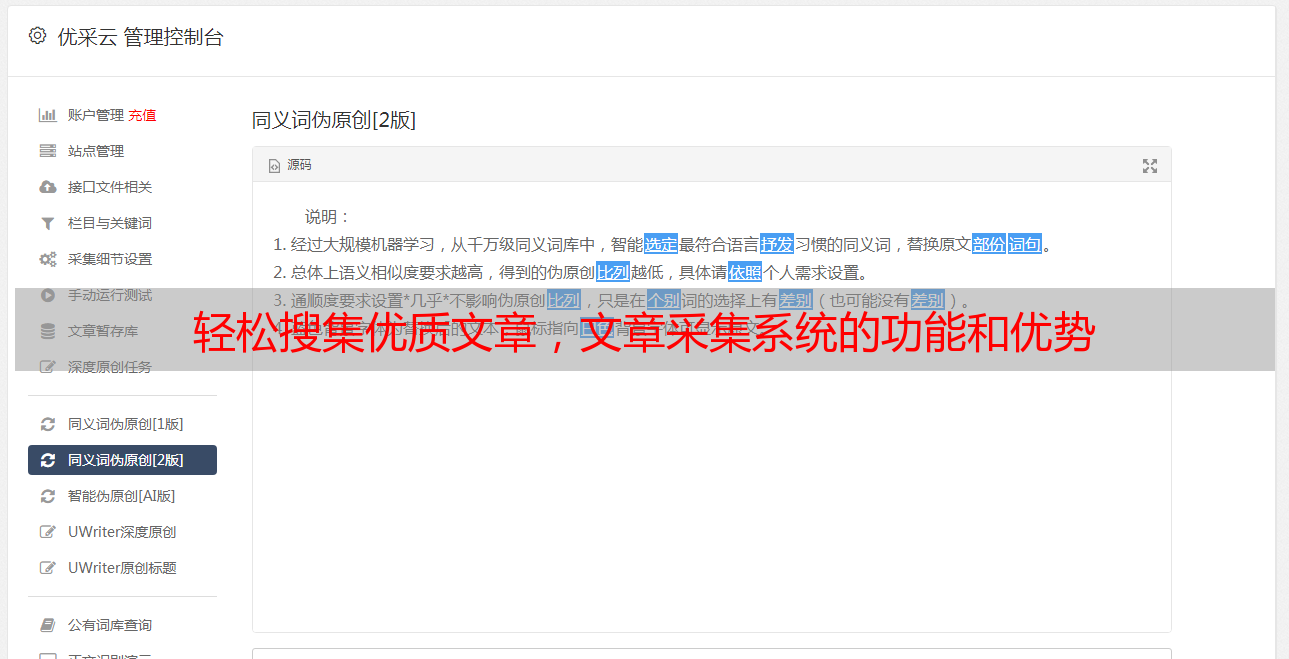 总之,在当今信息爆炸时代中,使用文章采集系统已经成为许多人必不可少的工具之一。无论是个人还是企业,在提高效率、降低成本、增强竞争力方面都能够发挥巨大作用。如果您正在寻找一款专业又实用的文章采集与SEO优化平台,请不要错过优采云(www.ucaiyun.com)。