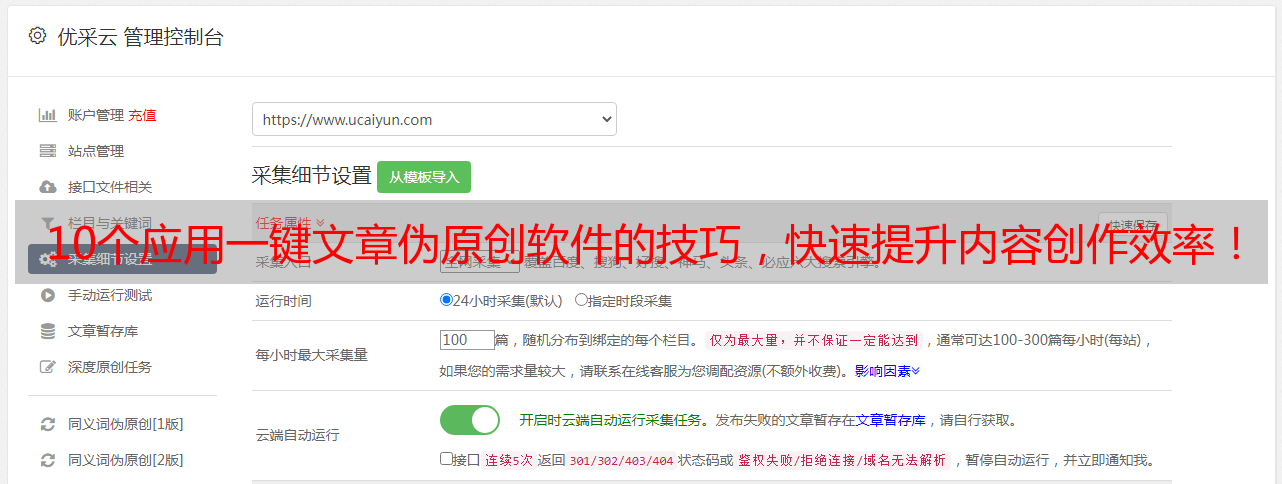虽然一键文章伪原创软件能够帮助用户快速生成大量相关内容,并且节省了时间和精力成本,但是也存在版权问题以及可能影响网站排名等风险。因此,在使用该类工具时必须慎重考虑,并且注意合理使用。如果您需要更多关于SEO优化相关信息,请关注优采云(www.ucaiyun.com)。
