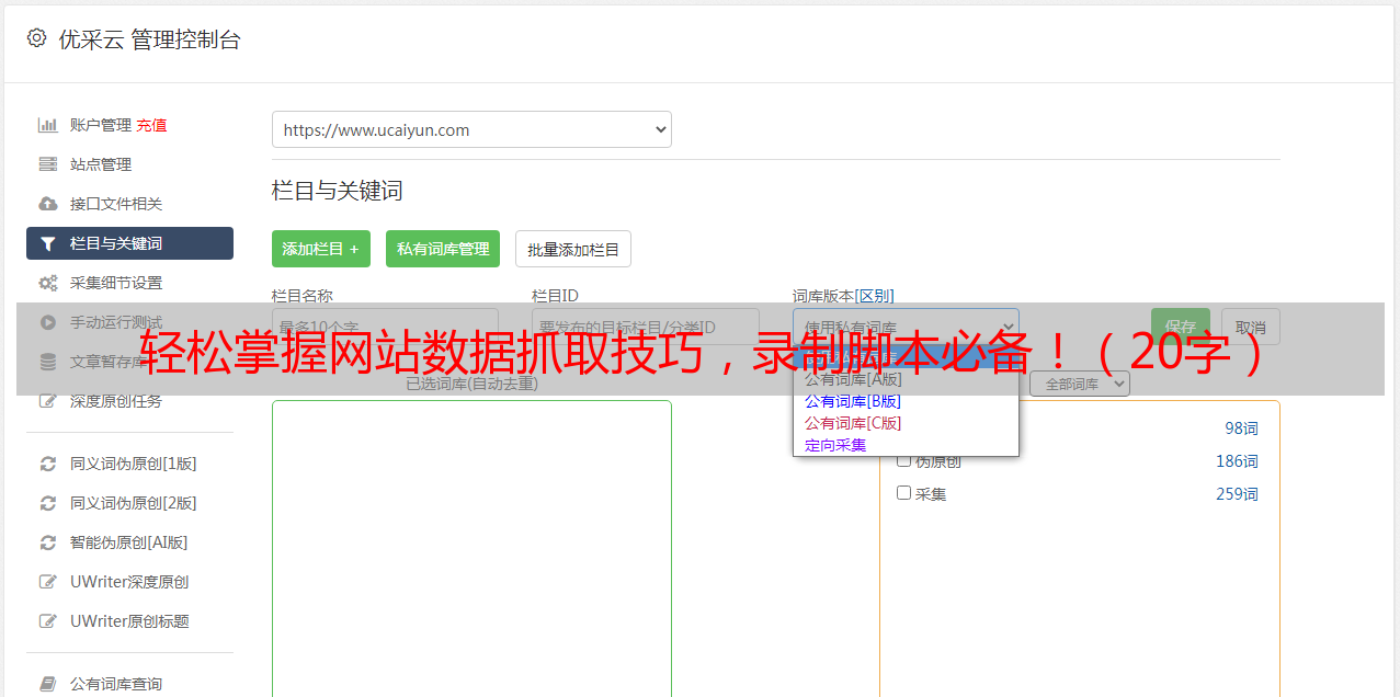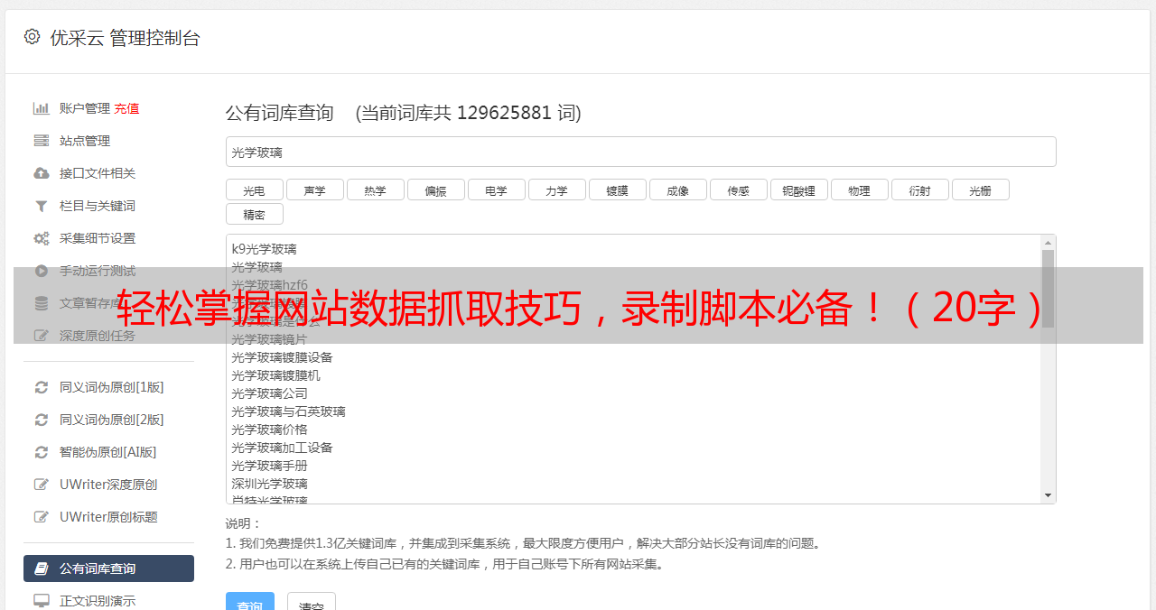 优采云 发布时间: 2023-03-14 01:11在当今互联网时代,数据是一种非常重要的资源。对于企业、学术界和政府等各个领域而言,获取数据是进行各种研究和决策的必要前提。而网站抓取数据录制脚本则成为了一种非常有效的数据采集方式。本文将从以下八个方面详细分析网站抓取数据录制脚本的相关内容。