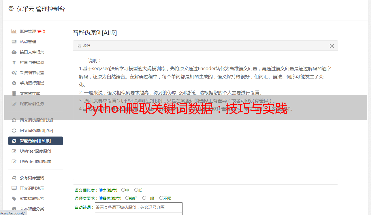 优采云 发布时间: 2023-03-14 14:15Python已经成为了全球最受欢迎的编程语言之一。对于SEO优化这个领域而言,Python更是一个不可或缺的工具。本文将介绍如何使用Python爬虫技术来获取关键词数据,从而帮助您更好地进行SEO优化。