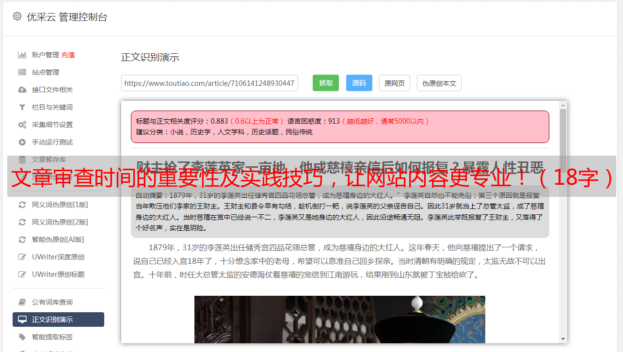 优采云 发布时间: 2023-03-14 20:13在信息爆炸的时代,网站文章已经成为了人们获取各种信息的主要途径之一。但是,由于信息更新速度快,网站管理员需要在不断更新文章的同时,保证文章内容的准确性和可靠性。因此,网站文章最后审查时间显得极为重要。本文将从十个方面介绍网站文章最后审查时间的重要性以及实践技巧。
