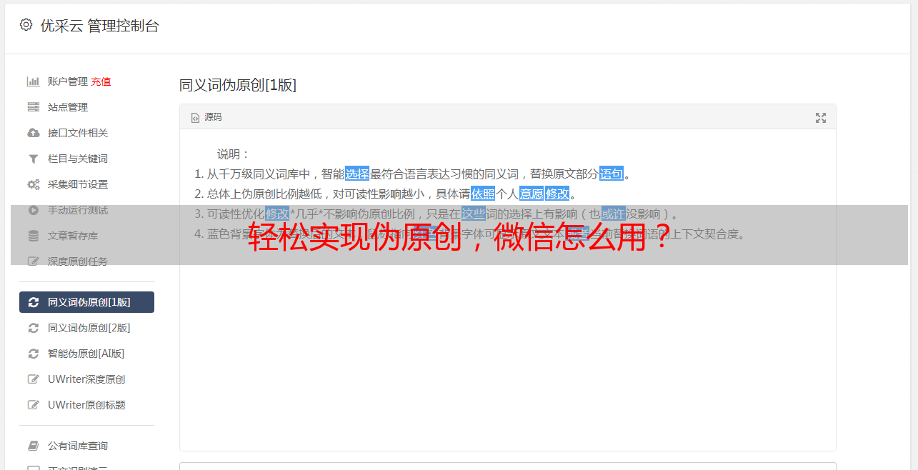 优采云 发布时间: 2023-03-15 09:18微信自媒体已经成为了现在很多人的副业或者主业,但是一篇好的文章需要花费大量的时间和精力去打磨。为了减少写作时间和提高效率,许多人使用了微信上的伪原创工具。本文将详细介绍如何使用这些工具,以便更好地满足读者的阅读需求。