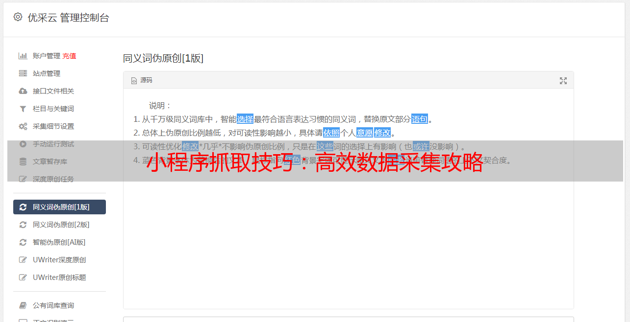 总体来说,小程序抓取是一种非常实用的技术手段,在数据采集方*敏*感*词*有广泛应用前景。但是在使用过程中也需要注意遵守相关法律法规和道德规范,并保持技术更新和创新。优采云提供SEO优化服务,请访问www.ucaiyun.com了解更多信息。