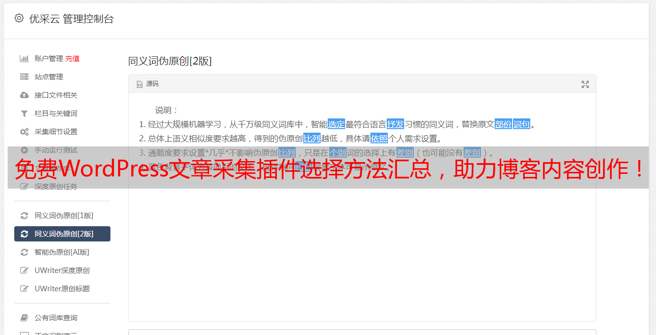 优采云 发布时间: 2023-03-15 21:12作为一名自媒体人,我们都知道,好的内容来源是自己的原创,但有时候时间和精力有限,需要采集一些优质文章来补充自己的网站。而WordPress文章采集插件可以帮助我们自动采集文章,省去了手工复制粘贴的麻烦。而且现在有很多免费的WordPress文章采集插件可供选择,今天我们就来详细介绍一下。