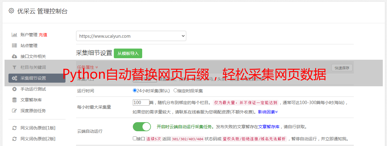 优采云 发布时间: 2023-03-16 08:13在SEO优化中,网页后缀对于搜索引擎排名有着重要的影响。然而,对于一个大型网站来说,手动更改每个网页的后缀是一项繁琐的任务。本文将介绍如何利用Python自动替换网页后缀,并采集每个网页的数据。