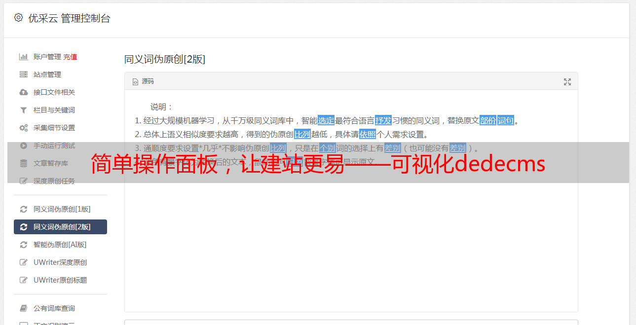 优采云是可视化dedecms内置的SEO优化工具。它可以帮助用户优化网站结构、关键词排名等方面,在搜索引擎中获得更好的排名。
