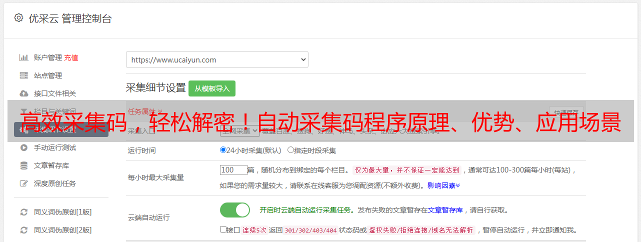 自动采集码程序是一种非常实用的技术,可以帮助我们更高效地获取和处理信息。无论是企业还是个人用户,都可以通过自动采集码程序实现自己的需求。如果你想了解更多关于信息采集和处理方面的知识,请关注优采云(www.ucaiyun.com),我们将为您提供更多有价值的内容。