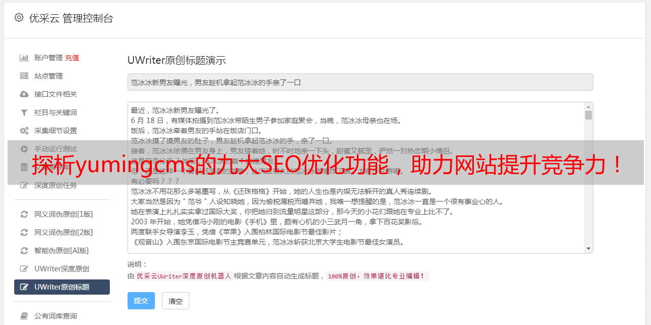 优采云 发布时间: 2023-03-26 22:13yumingcms是一款集成了SEO优化功能的自媒体平台,具有简单易用、高效稳定等特点。以下将从九个方面逐步分析yumingcms的优势。