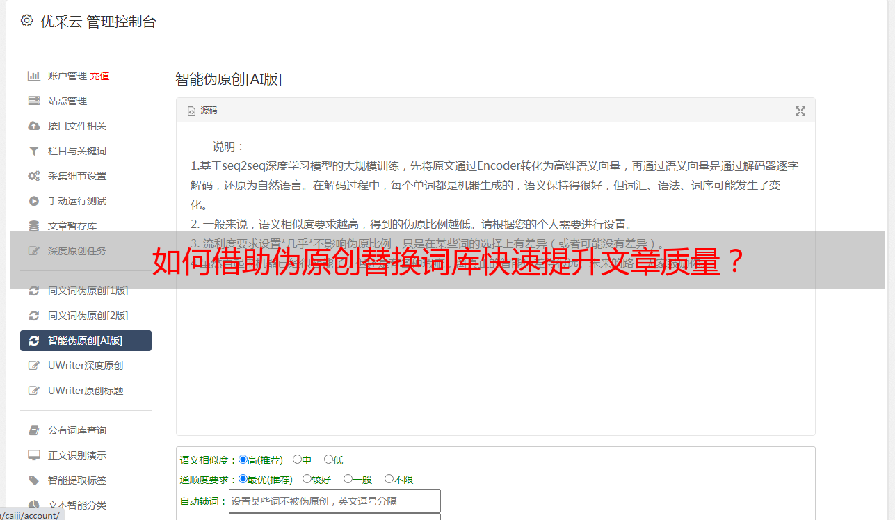 伪原创替换词库是一种能够快速帮助写手生成高质量文章的工具。它包含了大量的同义词、近义词、反义词等,可以将文章中的某些单词或短语进行替换,从而使得新生成的文章与原文相似度降低。