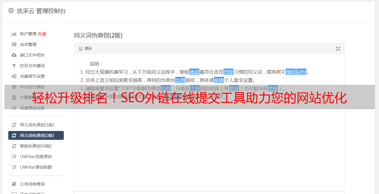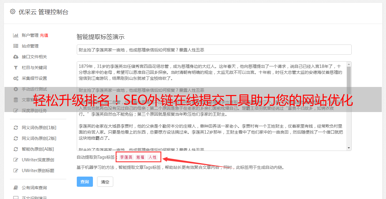 SEO优化是现代网站推广的重要手段,而外链建设是SEO优化中不可或缺的一环。使用SEO外链在线提交工具,可以帮助您快速建设高质量外链,提高您网站的搜索引擎排名和流量。如果您想了解更多关于SEO优化和网站推广的知识,请关注优采云官网www.ucaiyun.com。