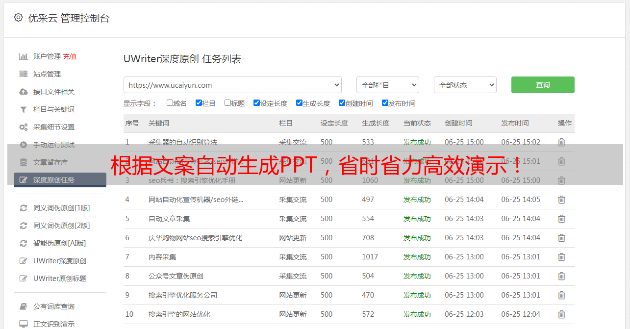 根据文案自动生成ppt的功能,不仅可以节省大量时间和精力,而且可以制作出高质量的演示文稿。无论是企业推广还是个人分享,这项功能都具有重要的实用价值。如果您想要了解更多关于演示文稿制作和优化方面的知识,请访问优采云官网www.ucaiyun.com,了解更多关于SEO优化和营销推广的相关知识。