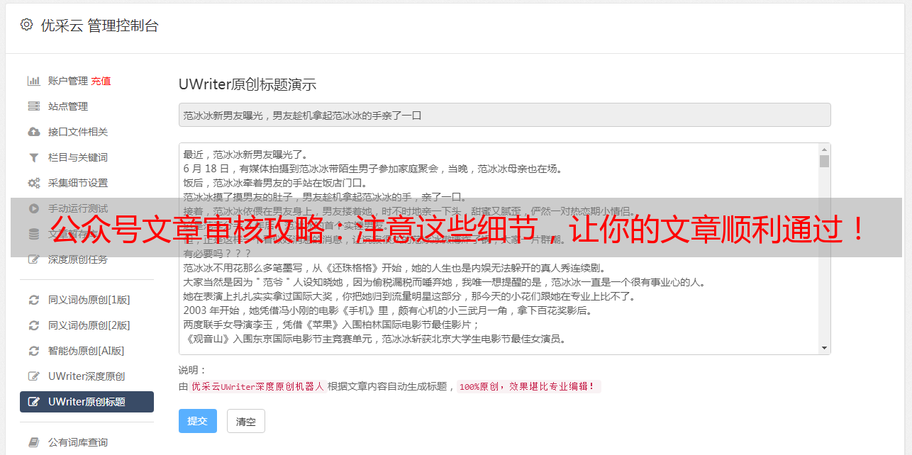 优采云 发布时间: 2023-03-29 05:09自媒体平台是一个充满机会的领域,但是要想在这个领域生存并不容易。其中一个重要的挑战就是让你的文章通过审核。如果你想让你的文章通过审核,那么你需要注意以下这些细节。以下是10个方面进行逐步分析讨论。