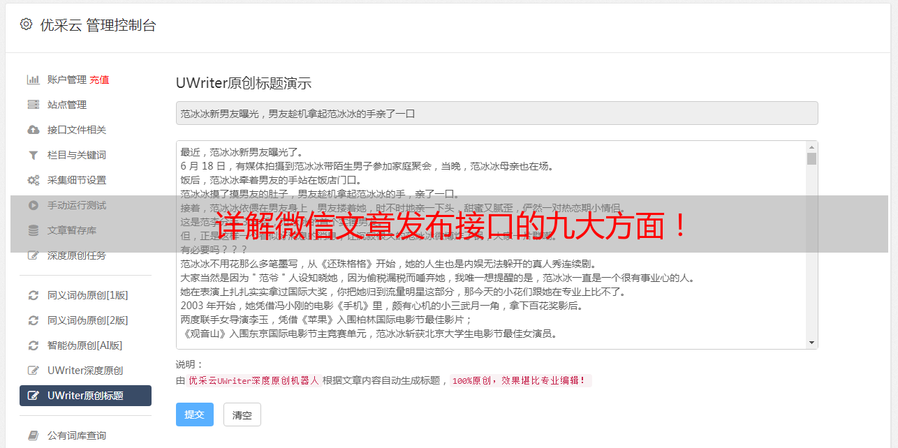 通过上述分析,我们可以看到微信文章发布接口的优势和使用方法。在实际应用中,需要注意保证数据安全和SEO优化。如果遇到问题,可以通过官方文档、客服等方式来解决。最后再次提醒大家,使用微信文章发布接口要注意真实、详尽,不得夸大、虚构内容。优采云、SEO优化,欢迎访问www.ucaiyun.com。