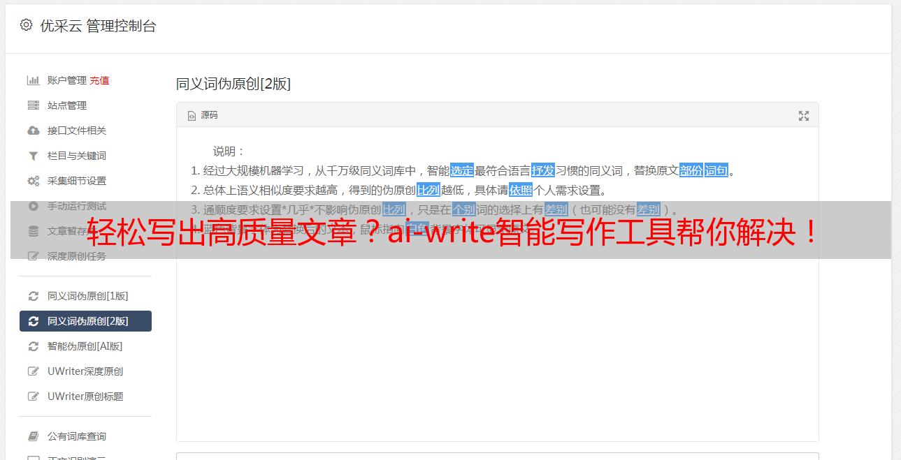 优采云 发布时间: 2023-03-30 16:25在互联网时代,内容创作已成为一项重要的职业,越来越多的人开始了解到优质内容对于网站排名和用户体验的重要性。然而,对于许多人来说,写作并不是一项容易的任务。幸运的是,随着ai-write智能写作工具的出现,这个问题迎刃而解。