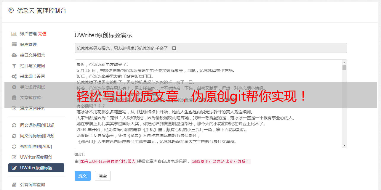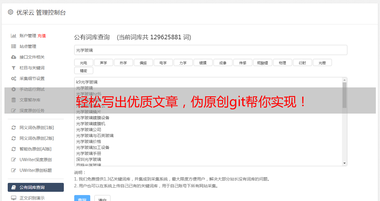 总结:伪原创git可以帮助我们快速生成高质量的文章,并且大大提高了写作效率。但是,在使用过程中也需要注意一些细节问题,比如关键词优化、图片视频插入、内部链接等等。只有在不断地尝试和实践中,才能真正掌握伪原创git的使用技巧。如果你想了解更多关于SEO优化和内容创作的知识,可以访问优采云官网(www.ucaiyun.com)获取更多信息。