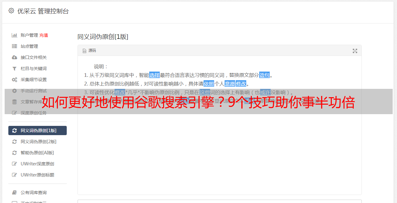 以上就是我分享的关于谷歌搜索引擎的优化方法。虽然这些方法不一定能够立即带来明显的效果,但是只要坚持不懈地努力,就一定会看到成果。如果你需要更多SEO优化方面的帮助,欢迎访问优采云(www.ucaiyun.com),我们提供专业的SEO优化服务和工具支持。