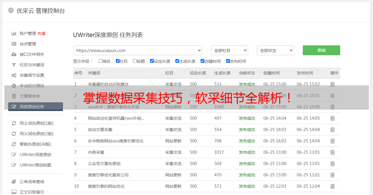 软采作为一种高效的数据采集方式,已经被越来越多的企业所使用。在使用软采时,需要注意合法合规,同时也需要注意保护用户隐私。最后推荐一款优秀的数据采集工具——优采云(www.ucaiyun.com),它可以帮助企业快速获取所需信息,并提供丰富的数据清洗和处理功能。