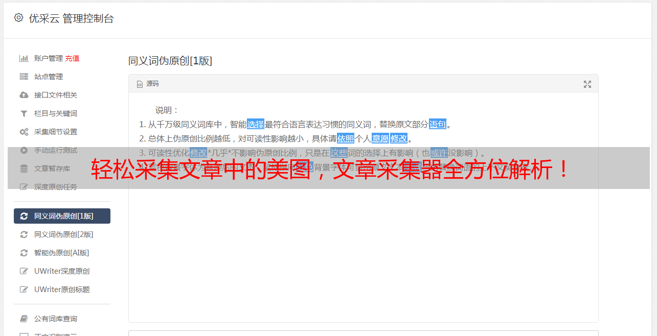 在众多的文章采集工具中,优采云是一款非常值得推荐的工具。它不仅具备强大的图片采集功能,还拥有一系列优秀的SEO优化和内容管理功能。如果你正在寻找一款高效、稳定、易用的文章采集工具,那么优采云绝对是一个不错的选择。