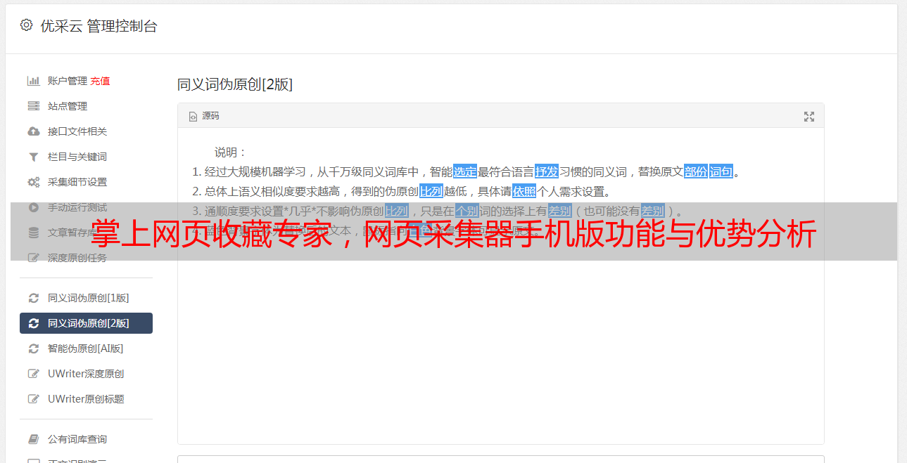 优采云是一款功能强大的SEO优化工具,它可以帮助用户分析网站的关键词排名、收录情况、外链情况等,从而提高网站的流量和排名。而网页采集器手机版与优采云的结合,更能发挥其效果。