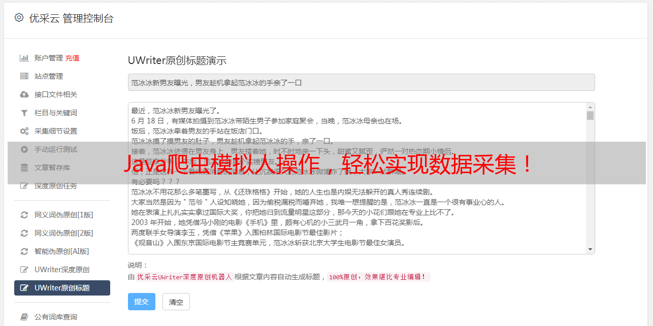 优采云 发布时间: 2023-04-01 02:09Java爬虫是目前最常用的数据采集方式之一,但是有些网站为了防止爬虫的访问,会设置反爬虫策略。这时候我们就需要使用模拟人操作来绕过这些策略。本文将从以下10个方面详细介绍如何使用Java爬虫模拟人操作实现数据采集。