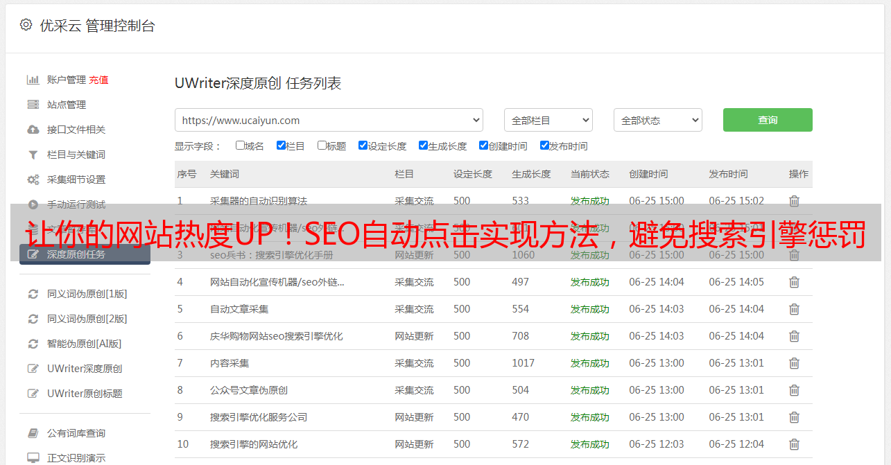 优采云 发布时间: 2023-04-01 04:09SEO自动点击是一种快速提高网站流量的方式,通过模拟人工点击,让搜索引擎认为你的网站受到了更多用户的关注,从而提高搜索排名。在本文中,我们将逐步分析SEO自动点击的原理、实现方法、优缺点、风险以及如何避免被搜索引擎惩罚等方面内容。