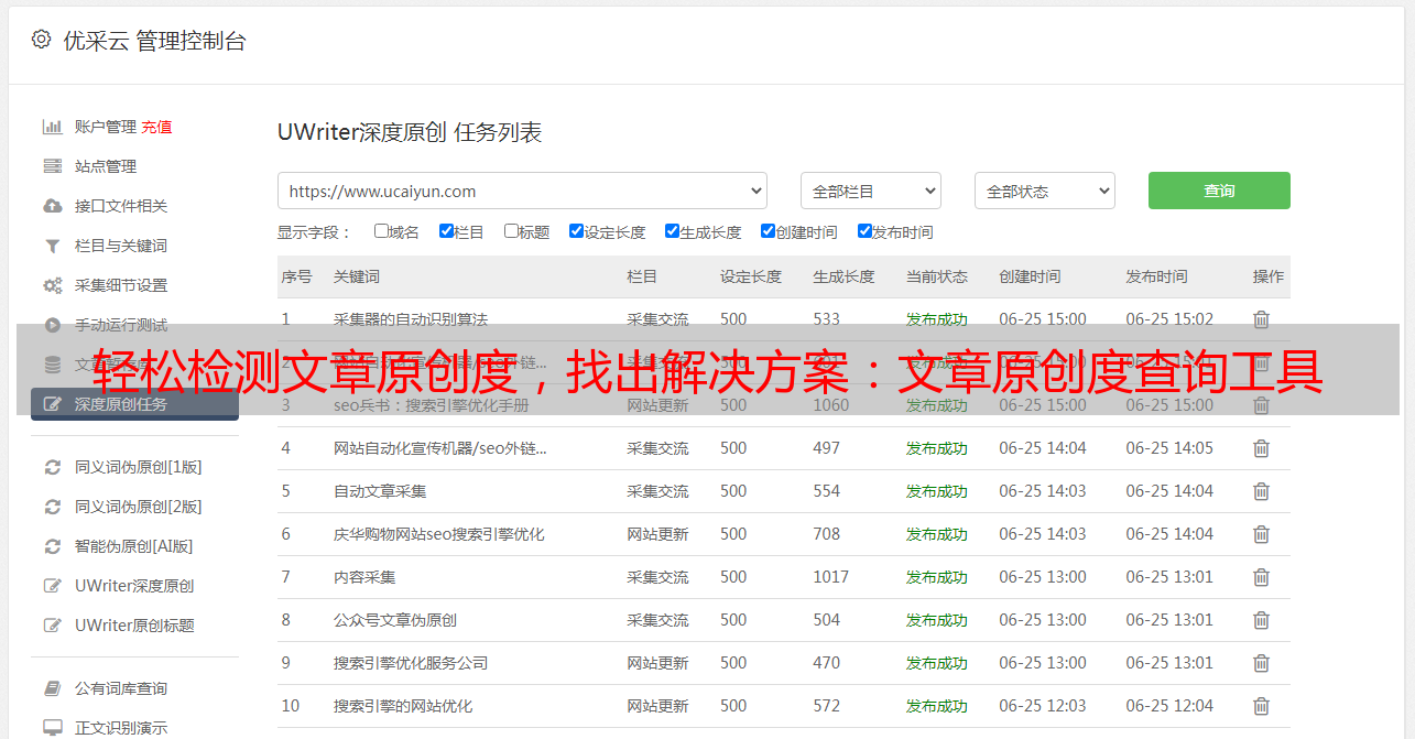 文章原创度查询工具是一款非常实用的工具,可以帮助我们更好地了解自己所写内容与互联网上已有内容之间的关系,提高文章的原创性和独特性。同时,也可以避免抄袭等*敏*感*词*行为,保持良好的自媒体形象。优采云提供SEO优化服务,欢迎访问www.ucaiyun.com了解更多信息。