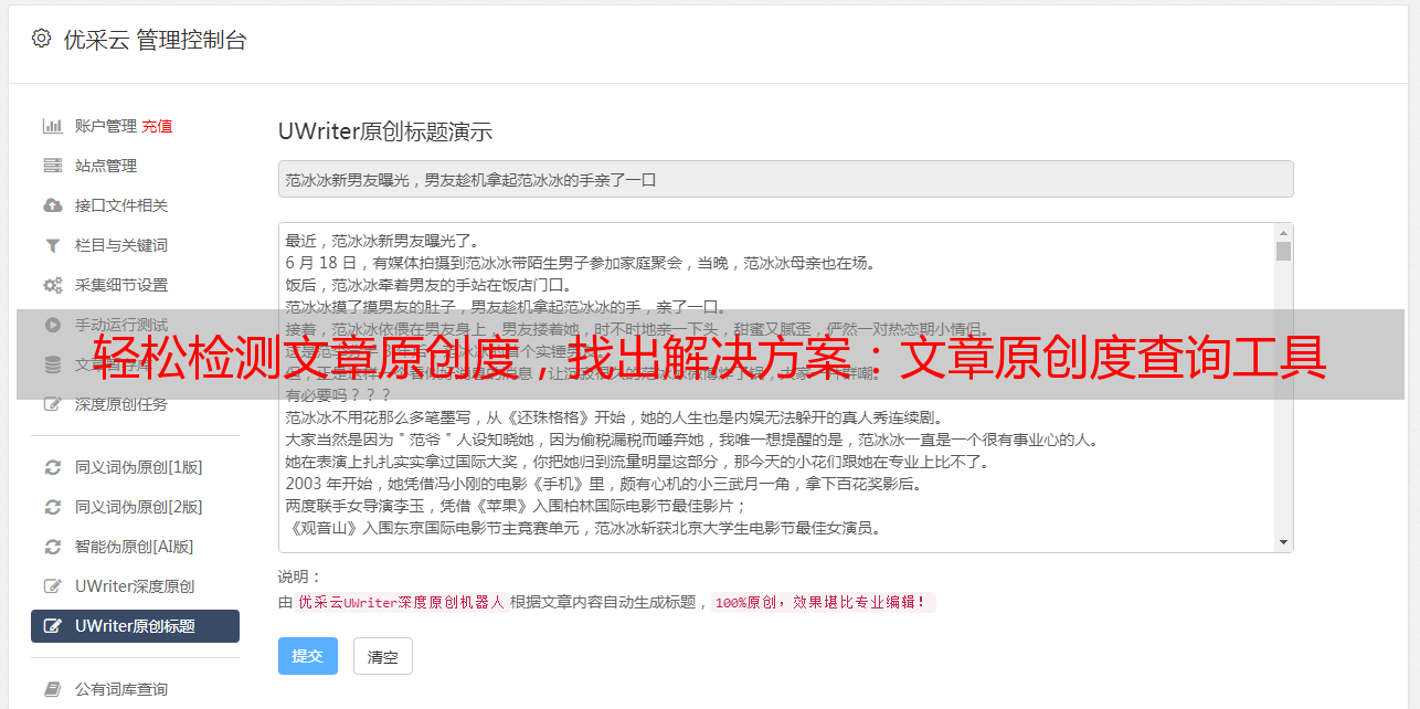 优采云 发布时间: 2023-04-01 11:18近年来,随着自媒体的兴起,越来越多的人开始关注文章的原创度。在这个信息大爆炸的时代,如何让自己的文章更有价值,成为了每个自媒体人都需要思考的问题。而文章原创度查询工具,则是解决这个问题的利器。本文将从多个方面详细介绍这一工具的使用方法和作用。