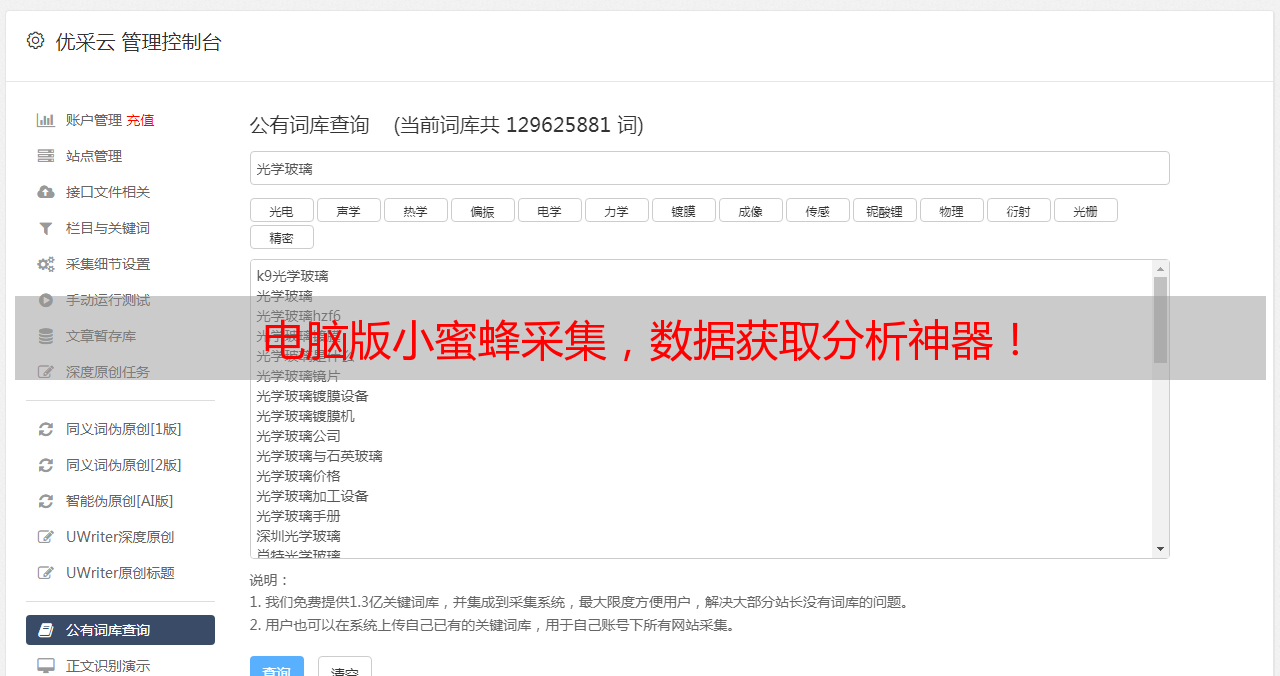 优采云 发布时间: 2023-04-01 11:18新款电脑版小蜜蜂采集,是一款专门为SEO优化而设计的软件。它可以在网页上自动抓取数据,并将其转换为可读性高、排版整洁的文本格式。这是一项非常有用的工具,尤其是对于那些需要大量收集数据并进行分析的人来说。