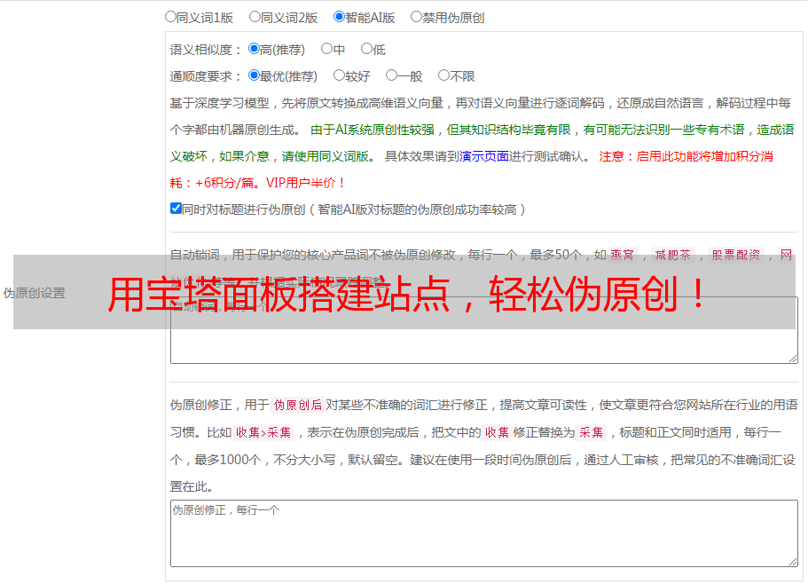优采云 发布时间: 2023-04-01 13:16作为一名站长,我们都知道SEO对于网站的重要性。而在SEO优化中,网站原创内容的质量也是至关重要的。但是,对于很多站长来说,原创文章的写作难度较大,因此很多人会选择使用伪原创工具来处理文章。而在使用宝塔面板搭建网站时,如何使用伪原创工具呢?本文将从以下八个方面为大家详细介绍。