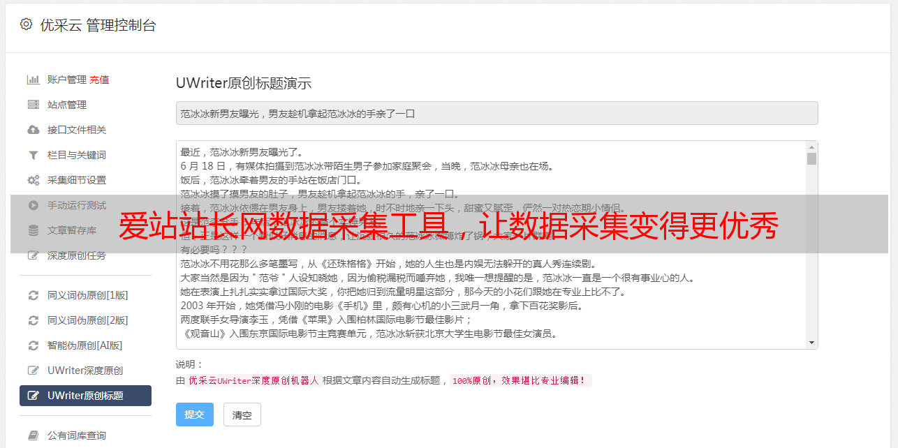 优采云 发布时间: 2023-04-01 15:20随着互联网的不断发展,越来越多的人开始关注自己的网站SEO优化。而进行SEO优化的关键在于获取准确、全面、及时的数据。今天,我要向大家介绍一款非常优秀的数据采集工具——爱站站长网数据采集工具。