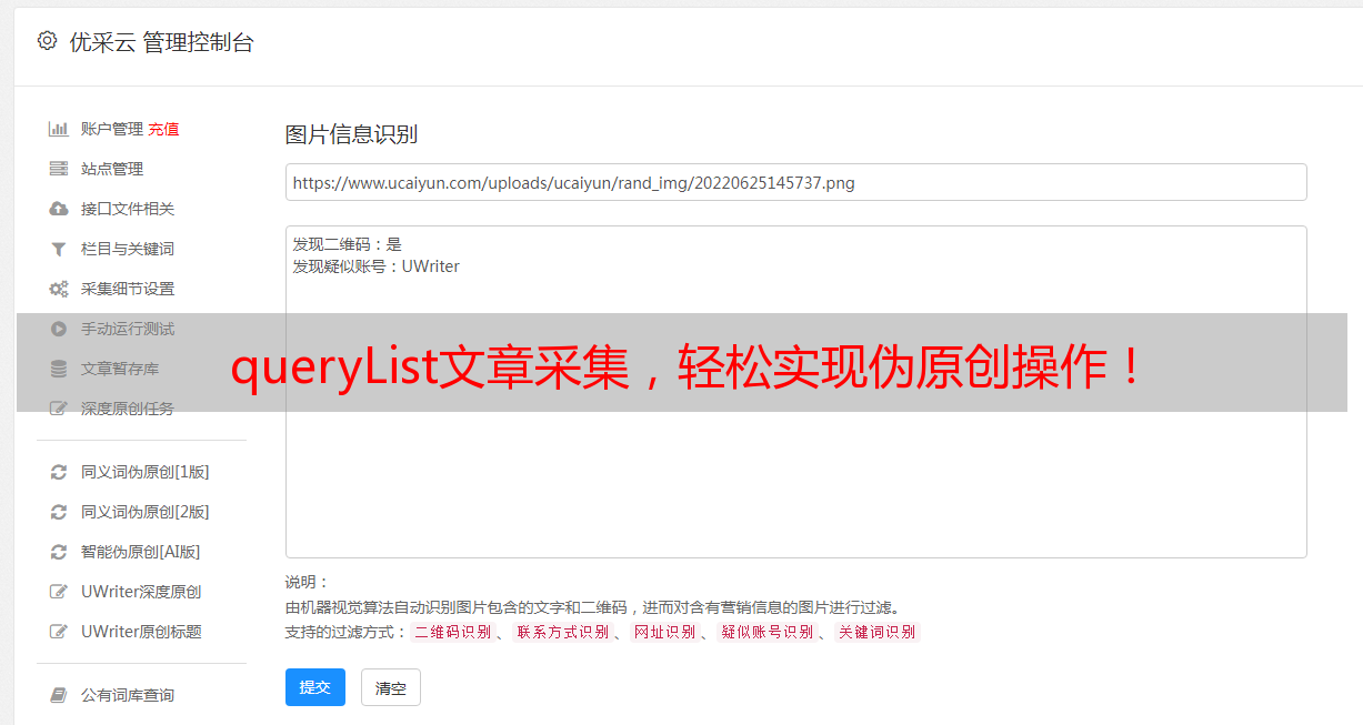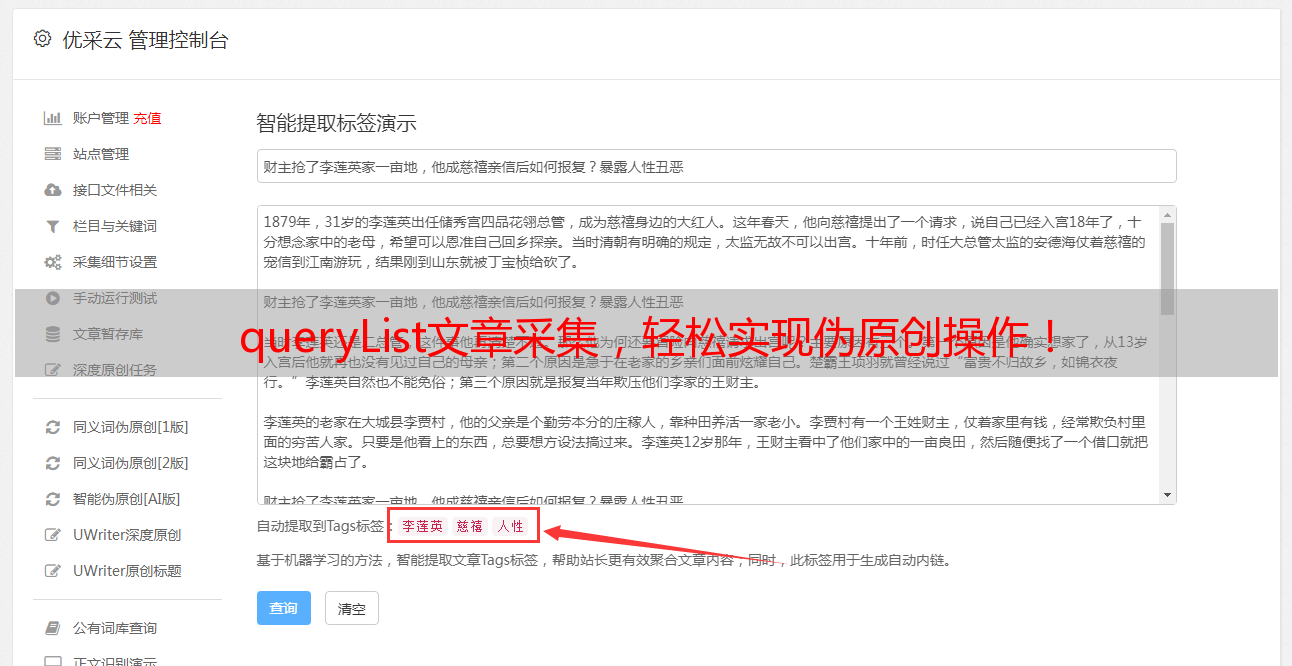优采云 发布时间: 2023-04-01 16:24自媒体时代,内容创作已经成为一个热门话题。在这个信息泛滥的时代,如何让自己的内容更具有吸引力和竞争力?众所周知,好的内容是吸引粉丝和读者的关键。然而,对于很多自媒体人来说,时间和精力有限,他们需要更快地生成高质量的内容。本文将介绍一种queryList文章采集工具,以及如何使用它进行伪原创操作。