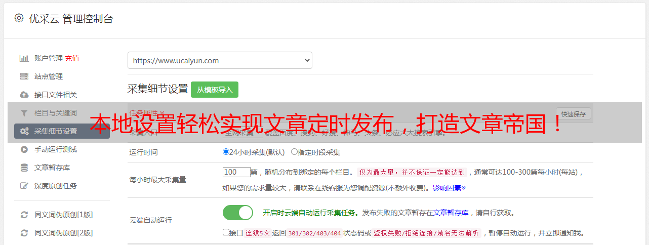 优采云 发布时间: 2023-04-01 18:18随着自媒体的兴起,越来越多的人开始关注如何提高自己的文章曝光率。而对于自媒体人来说,想要在众多内容中脱颖而出,除了内容质量外,还需要注意发布时间。本文将介绍如何利用本地设置实现文章定时发布,从而打造属于自己的“文章帝国”。