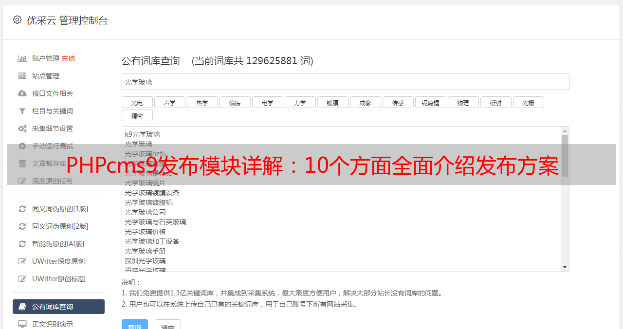 通过本文的介绍,相信大家已经对PHPcms9发布模块有了更加深入的了解。PHPcms9发布模块具有多种类型的内容创作和发布功能,同时还支持自定义字段和SEO优化等高级功能。对于想要快速构建并发布各种类型内容的网站管理员来说,PHPcms9发布模块无疑是一个非常好的选择。如果您想要了解更多关于优采云和SEO优化方面的信息,请访问我们的官方网站:www.ucaiyun.com。