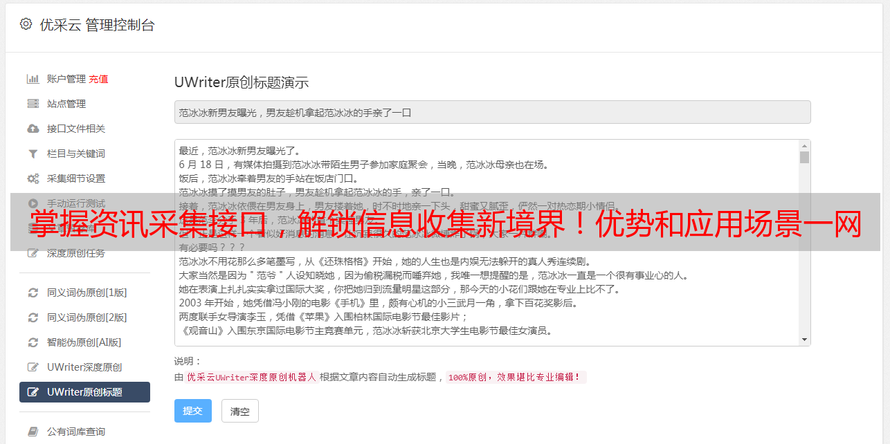 优采云 发布时间: 2023-04-01 18:19作为自媒体人,我们的日常工作就是不断地搜集、整理、发布新鲜有趣的内容。而资讯采集接口就是我们最好的工具之一。那么,什么是资讯采集接口?它有哪些优势和应用场景呢?本文将从以下八个方面进行分析。