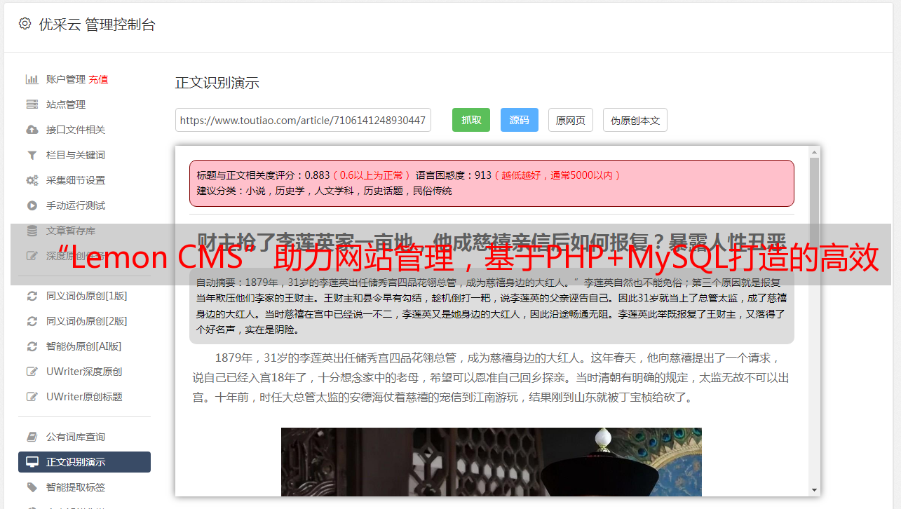 优采云 发布时间: 2023-04-01 22:11随着互联网的普及,越来越多的人开始尝试将自己的想法、作品和产品通过网站展示给更多人。然而,对于大部分人来说,搭建一个网站还是一件比较困难的事情。不过,有了Lemon CMS,这一切都变得异常简单。