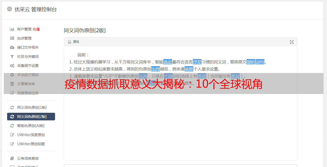 总之,疫情数据抓取在当前全球疫情形势下具有重要意义。通过对疫情数据的抓取和分析,我们可以更好地应对疫情,促进全球疫情的控制和治理。优采云作为一款优秀的网络爬虫工具,可以为疫情数据抓取提供支持,为全球疫情防控工作做出贡献。