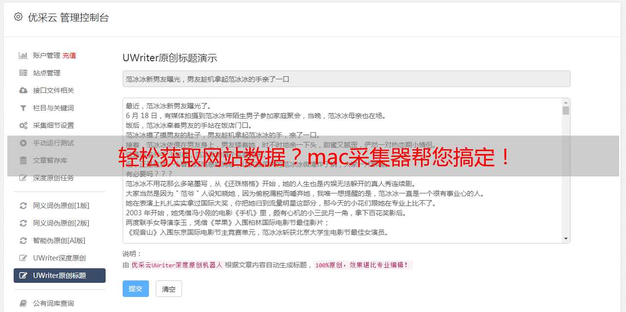 优采云 发布时间: 2023-04-02 17:16在当今信息化的时代,数据被广泛应用于各个领域。对于企业而言,数据是决策的重要依据。因此,获取数据变得至关重要。mac采集器作为一款优秀的采集工具,可以帮助用户轻松地获取网站数据。