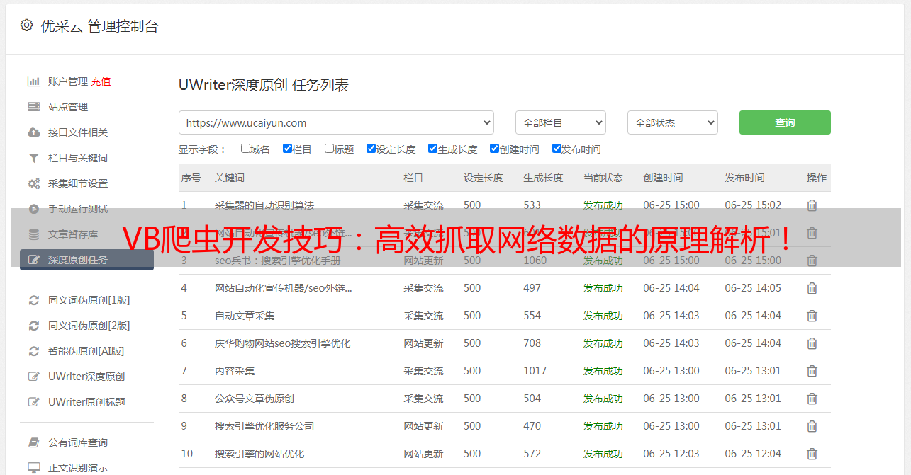 本文介绍了使用 VB 语言开发高效网络爬虫的方法和技巧,包括网络请求库、HTML 解析库、数据存储、多线程处理、异常处理等方面。同时也提到了 SEO 优化的重要性。希望本文对大家有所帮助,更多信息请访问优采云官网:www.ucaiyun.com。