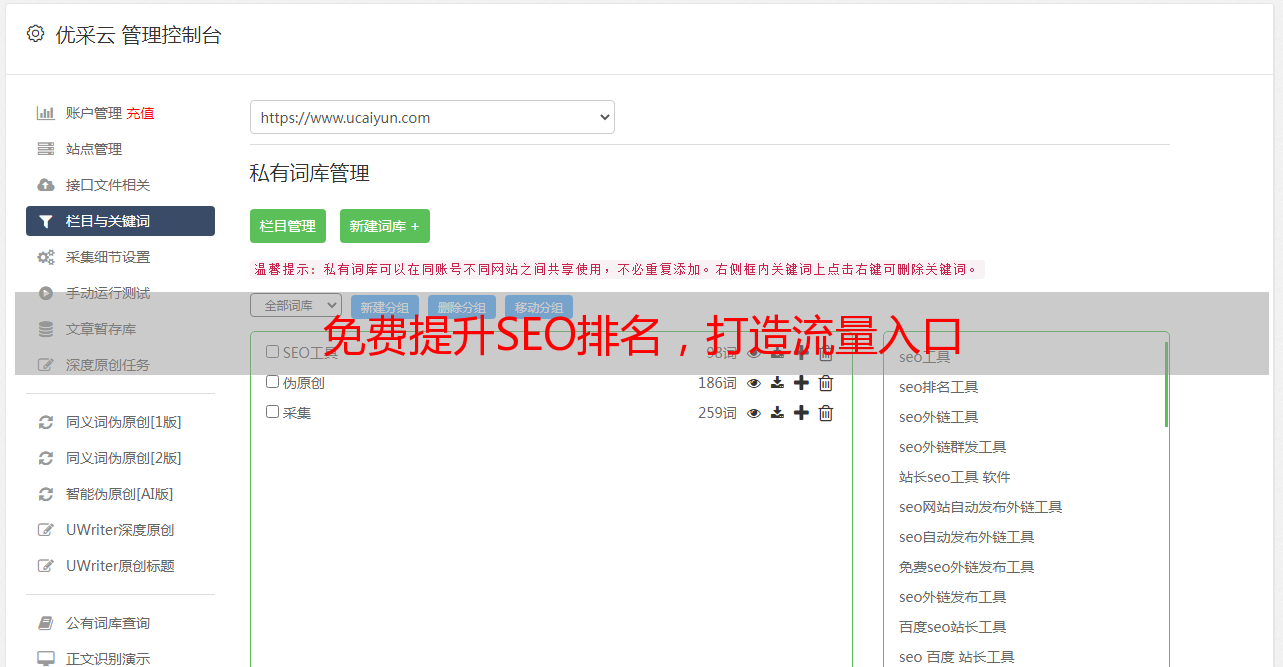 SEO排名免费并不是难以实现的事情,只要有正确的方法和技巧,就能够打造自己的免费流量入口。本文介绍的方法仅仅是冰山一角,如果想要了解更多关于SEO优化的知识,可以关注优采云(www.ucaiyun.com),这是一个专业的SEO优化服务平台,为网站提供全方位的SEO咨询和服务。