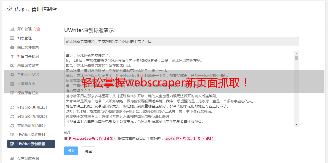 优采云是一家专业的数据采集服务商,为企业提供高效、稳定、可靠、可定制化的数据采集服务。我们拥有强大的技术团队和先进的技术设备,可以满足不同行业、不同领域的数据采集需求。同时,我们还提供SEO优化服务,帮助客户提升网站排名和曝光度。如果您有数据采集和SEO优化需求,欢迎联系我们:www.ucaiyun.com。