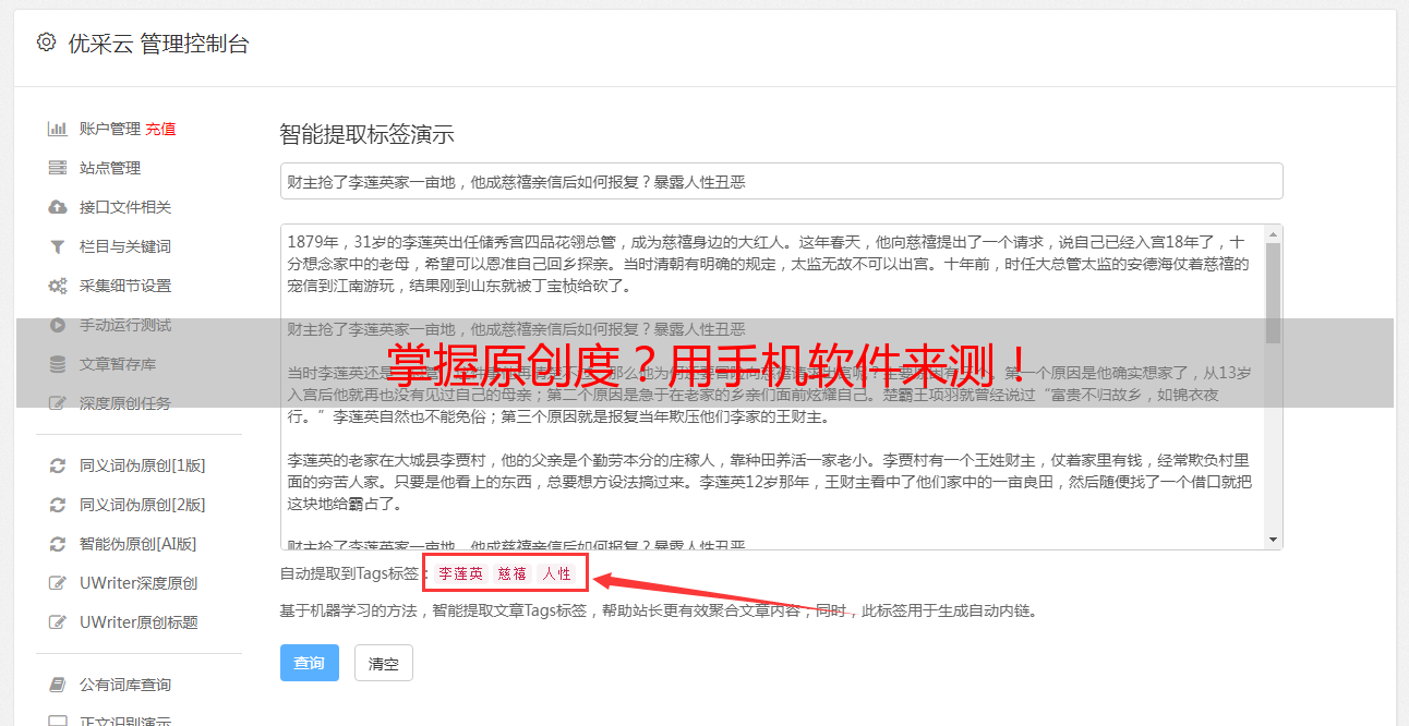 优采云 发布时间: 2023-04-03 05:07想要写好一篇文章,除了内容有趣、结构合理、语言流畅之外,还需要一个重要的元素——原创度。一篇内容丰富但缺乏原创度的文章,很难引起读者的兴趣和共鸣。因此,为了确保自己的文章在海量信息中脱颖而出,我们需要一个测原创度的手机软件。