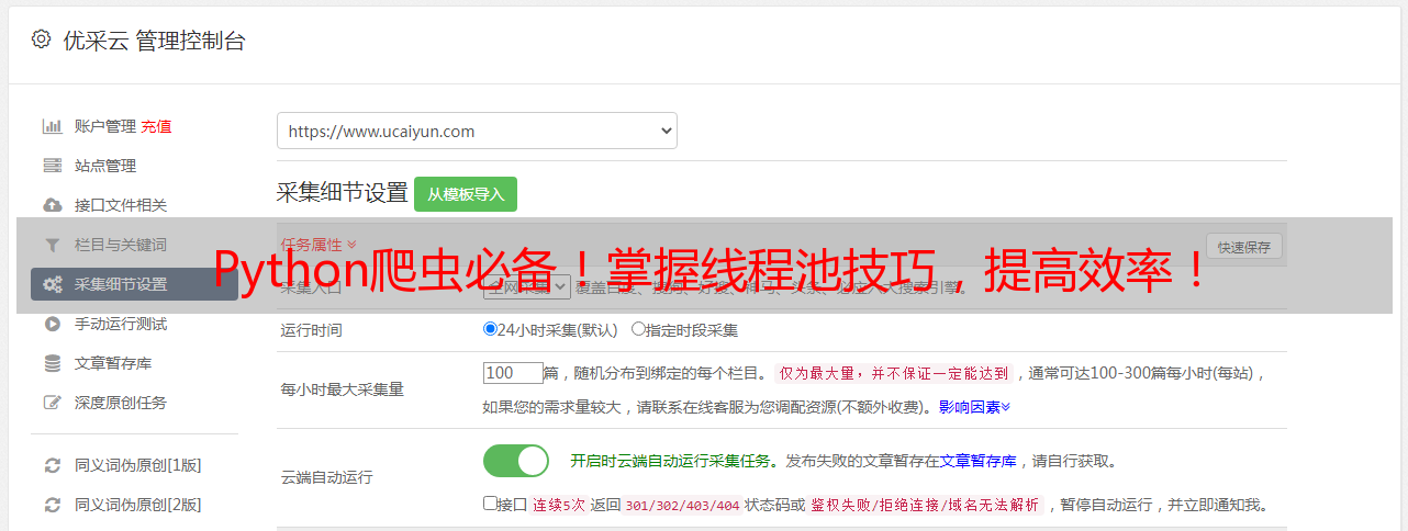 优采云 发布时间: 2023-04-03 15:15Python线程池爬虫是近年来爬虫领域的热门话题,利用线程池可以大大提高爬取效率,解决单线程爬取速度慢、耗时长的问题。本文将从以下10个方面详细介绍Python线程池爬虫的相关知识和应用。