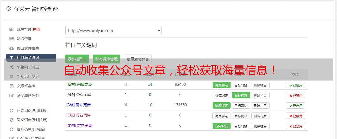 -第三方平台:例如“优采云”,可以通过设置关键词、时间等条件来搜索公众号文章,并将结果保存在云端。