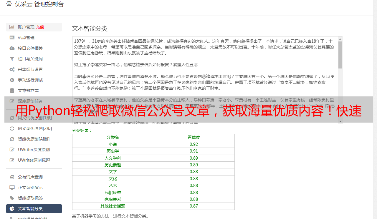 通过本文的介绍,相信读者已经了解了如何使用Python爬虫技术爬取微信公众号文章。当然,在进行爬虫操作时需要注意相关法律法规,不得进行非法爬取。如果您需要更加专业的爬虫服务,可以联系优采云,我们将为您提供SEO优化、数据分析等全方位服务。