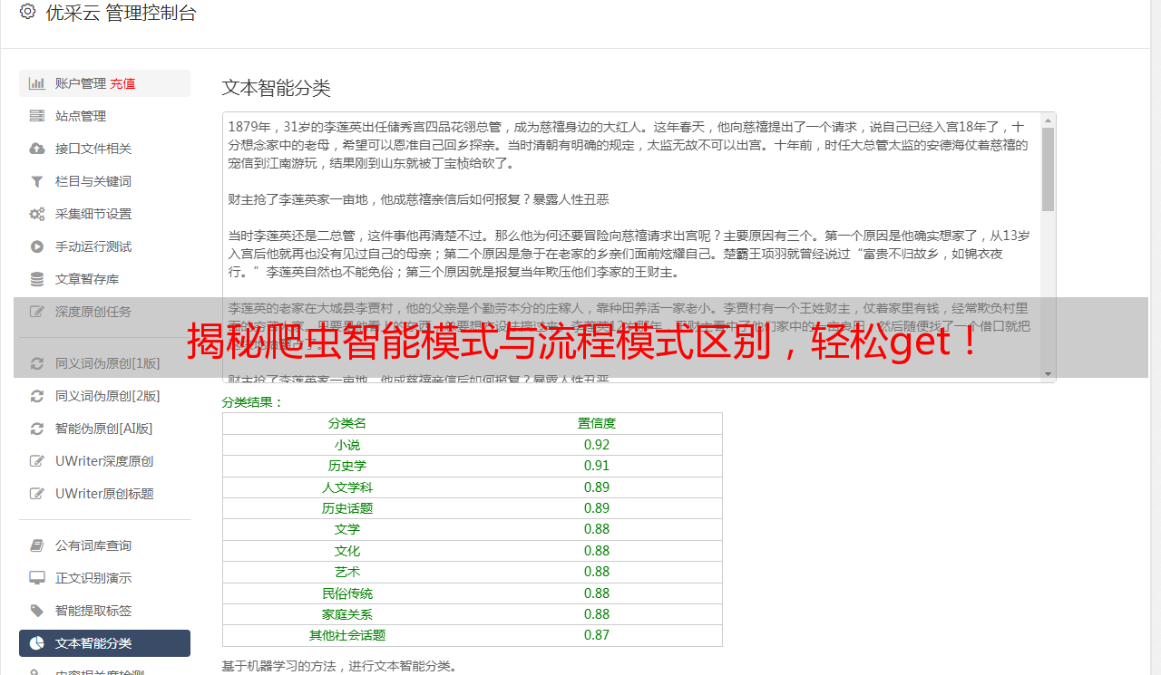智能模式和流程模式各有优缺点,在实际应用中需要根据具体场景选择合适的工作方式。同时,在进行爬虫抓取时,需要注意合理使用反爬虫策略,并且进行SEO优化以提高网站排名。优采云是一款非常实用的爬虫工具,可以帮助用户实现智能模式和流程模式的自动切换,并且支持SEO优化。如果您需要进行爬虫抓取,不妨试试优采云吧!优采云官网:www.ucaiyun.com。