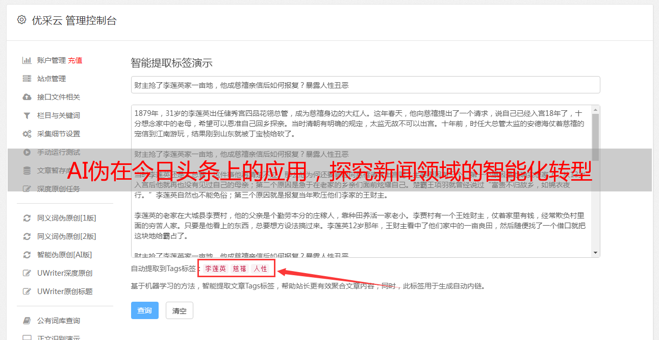 优采云是一款SEO优化工具,可以帮助网站提高排名,增加曝光率。在新闻领域,优采云可以帮助媒体提高新闻的曝光率和点击量,增加广告收入。